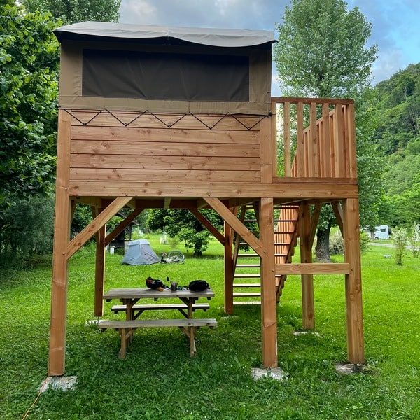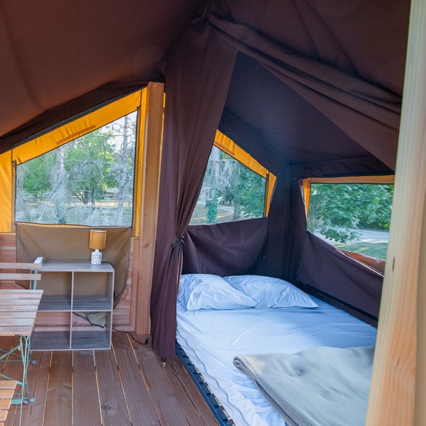 If you are looking for the comfort of ready-to-rent accommodation without compromising on the authenticity of camping, our Lonna tent is for you: a real canvas and wood cocoon built on stilts, ideal for stopovers for two. Fully equipped, all you have to do is settle in and relax after a day of exploring or cycling!